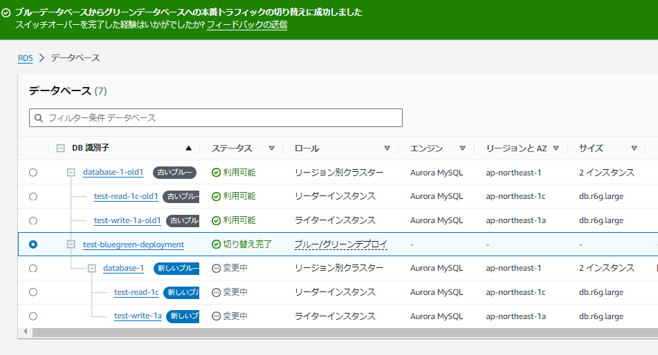 database-1-green-5pawyl | クラスター | September 27, 2024, 17:17 (UTC+09:00) | Updated to use DBParameterGroup test-aurora-mysql80-cpg |