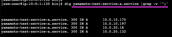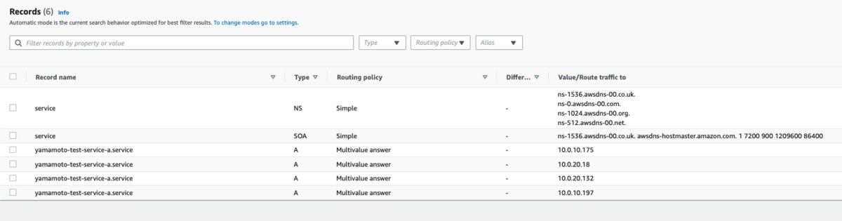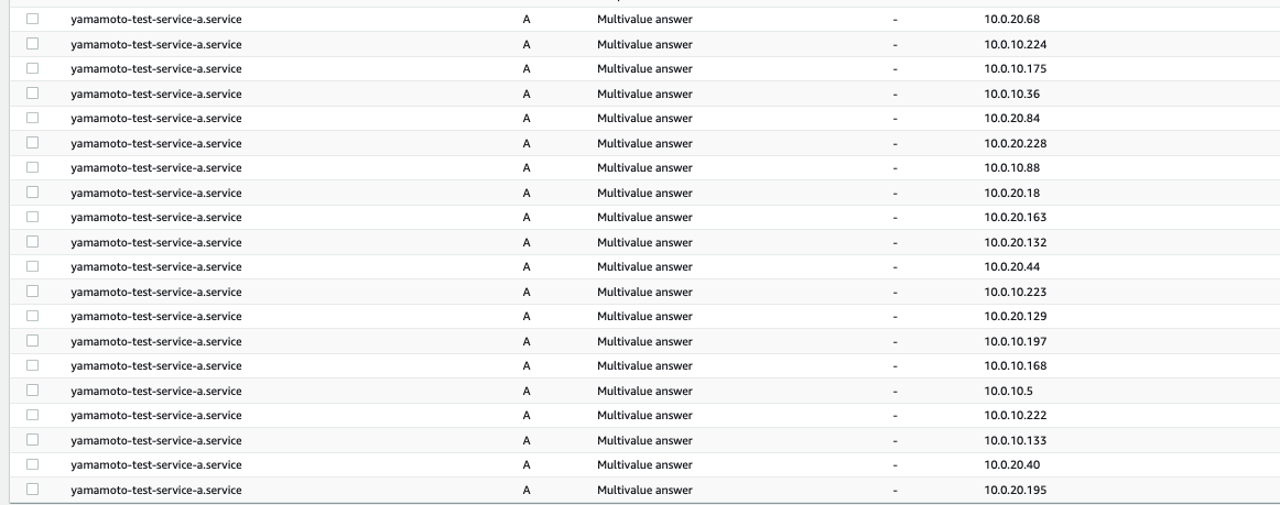 サービスのタスク数を 2つに設定しているため 「yamamoto-test-service-a.service」のAレコード が 2つあります