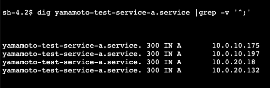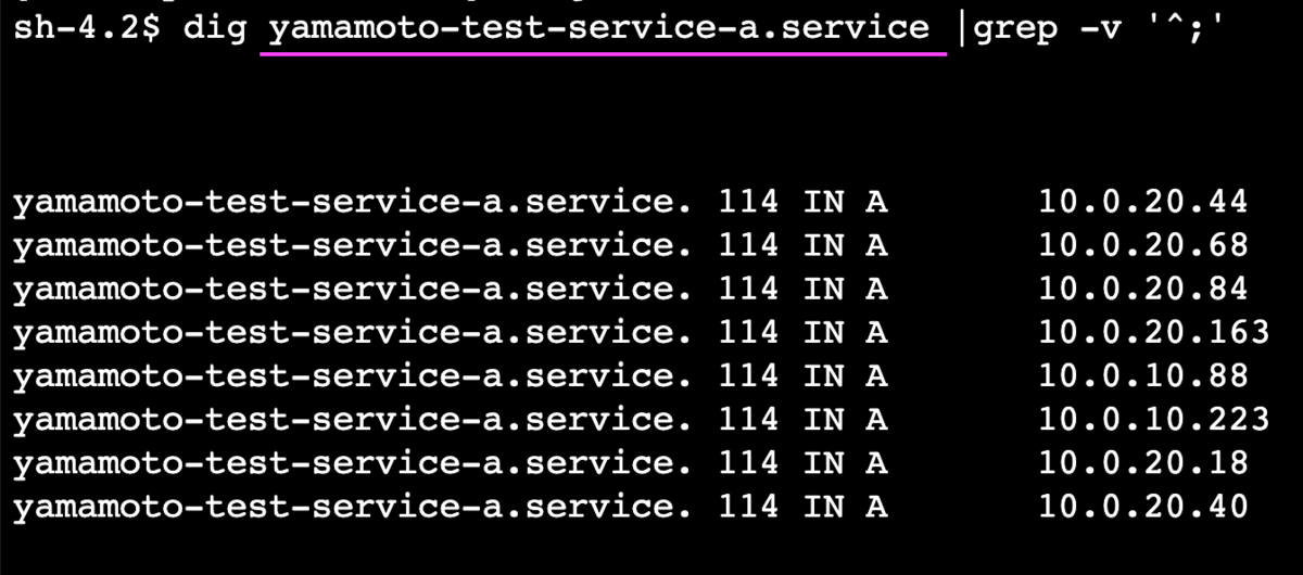 このサービスは「サービスの検出名.名前空間名」すなわち「yamamoto-test-service-a.service」というDNS名になります