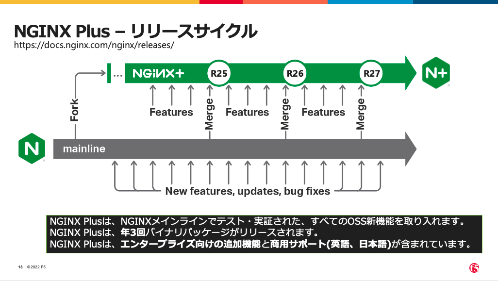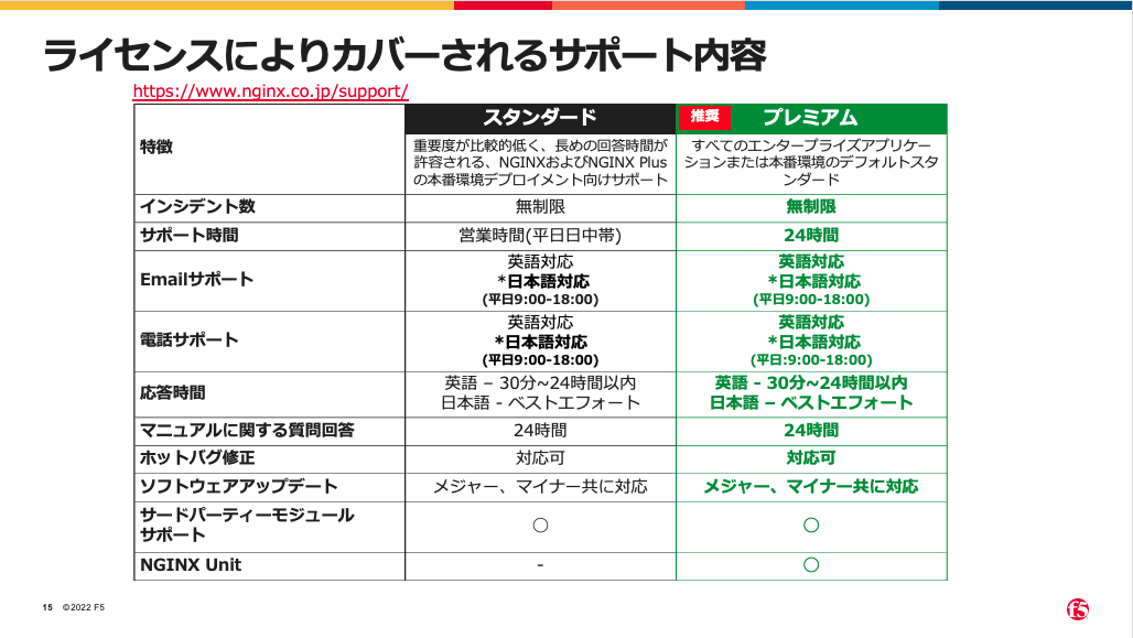 NGINXはOSSがベースとなるため、基本はコミュニティサポートですが、NGINX Plusより右の構成については、サブスクリプション型で、F5ネットワークス社の有償サポートを受けることが出来ます。