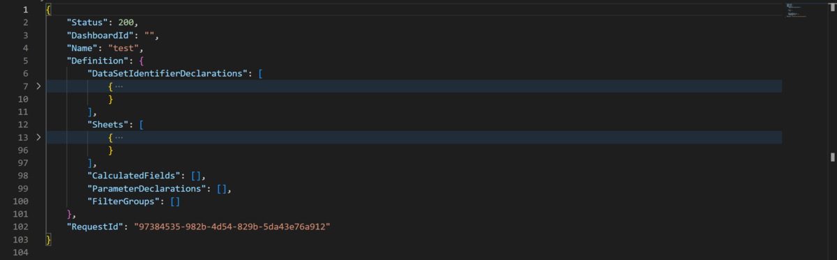 aws quicksight describe-dashboard-definition --aws-account-id <AWSアカウントID> --dashboard-id <ダッシュボードID> > test.json