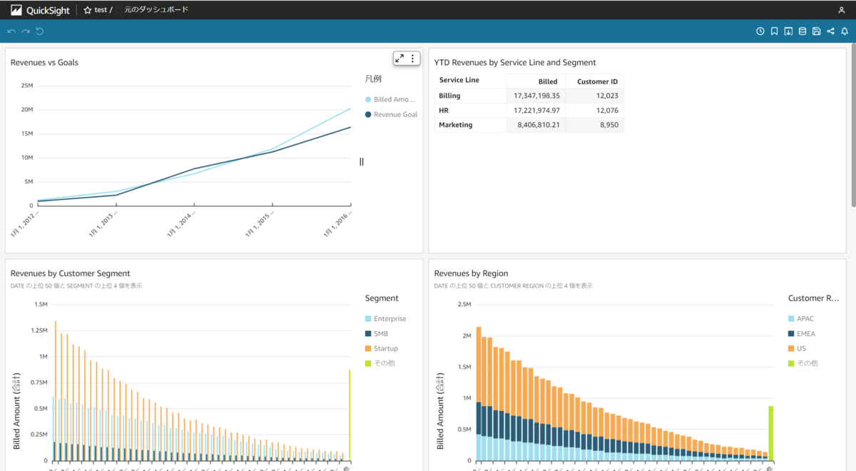 今回はQuickSightで事前に準備されているサンプルダッシュボードを使って検証していきます。