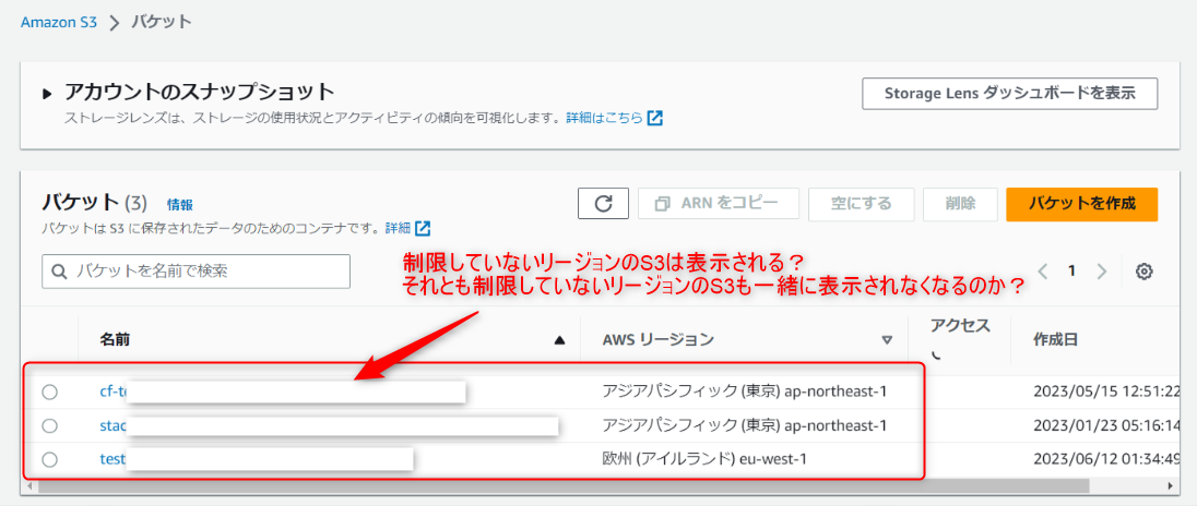 S3を例にすると「操作はもちろんできないだろうが、そもそもすべてのリージョンのバケットが表示されないのか?それとも禁止しているリージョンのバケットのみ表示されないのか?」などと考えていました。