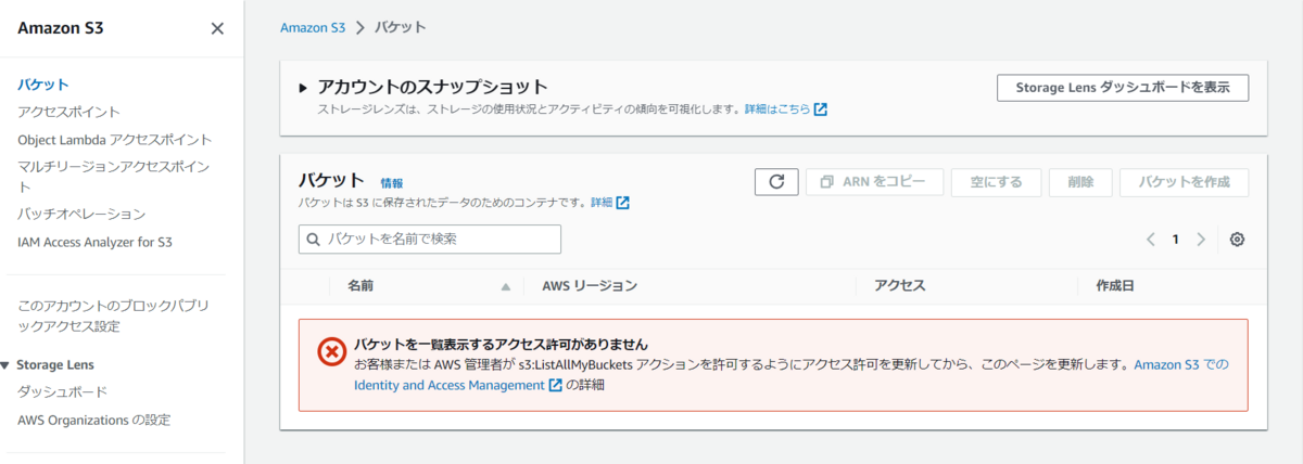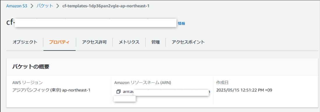 ただ、S3では制限しているリージョンの情報はバケットの概要(AWSリージョン、ARN、作成日)以外はエラー表示になっていました。