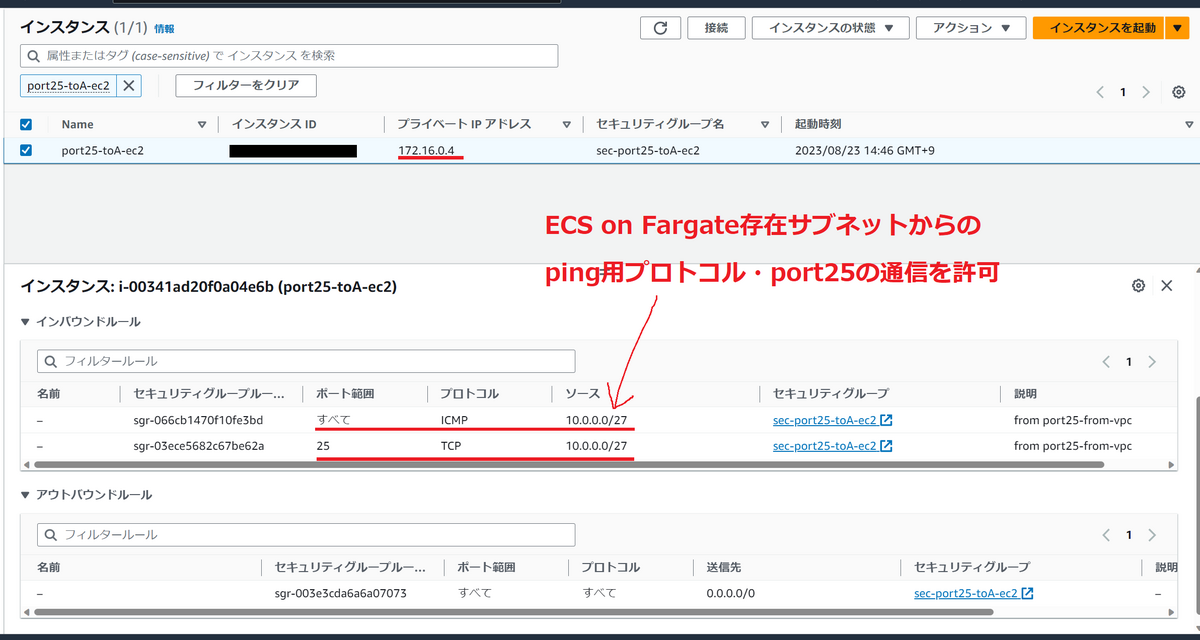 ECS on Fargateも同様であれば、「172.16.0.4」を割り振っているメール送信サーバAへのport25通信は成功するはずです。