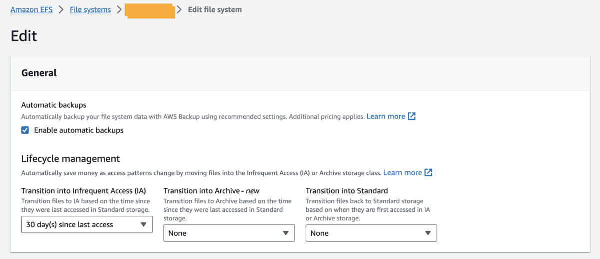 Amazon S3 が保存するオブジェクトの最適化を行われてきたように、Amazon EFS も最適化を実現できるサービスかと思われます。 既に私の個人検証環境でもその設定ができることを確認しました。