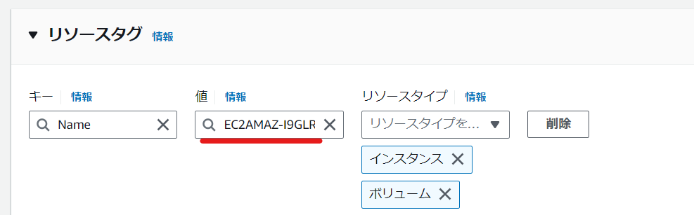 - 同様に「リソースタグ」項目において、「キー」が「Name」となっているタグを復元されるEC2で設定したい値に編集します
