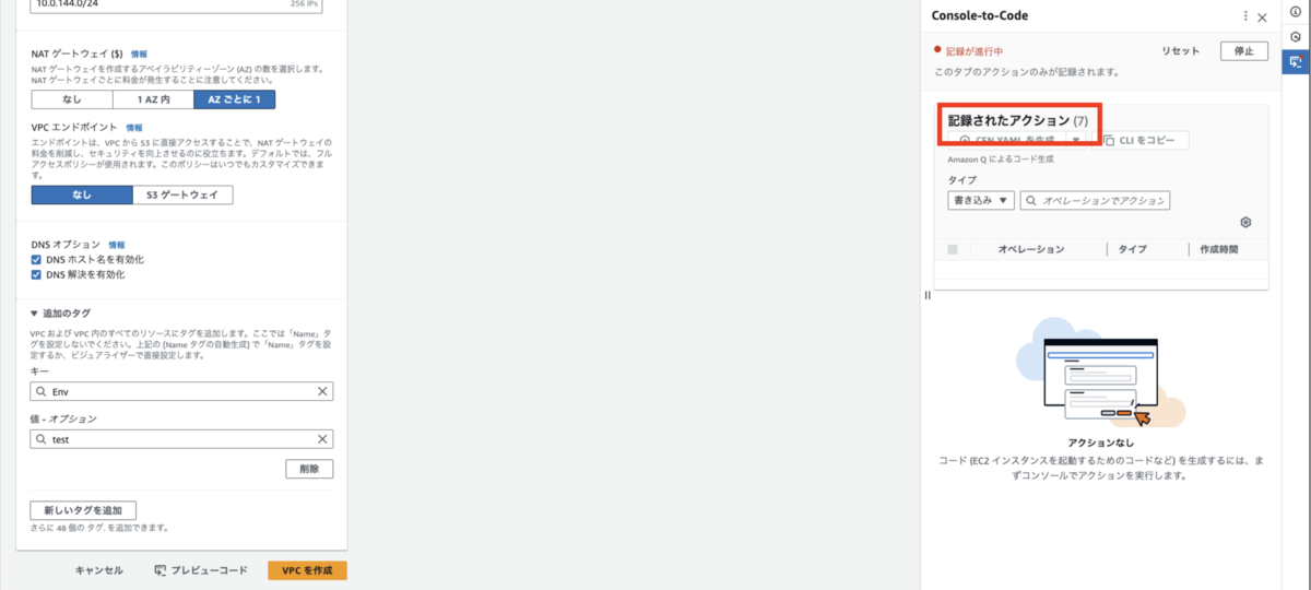 記録を開始したら、実際にVPCを作成していきます。 実行したアクションが記録されていきます。