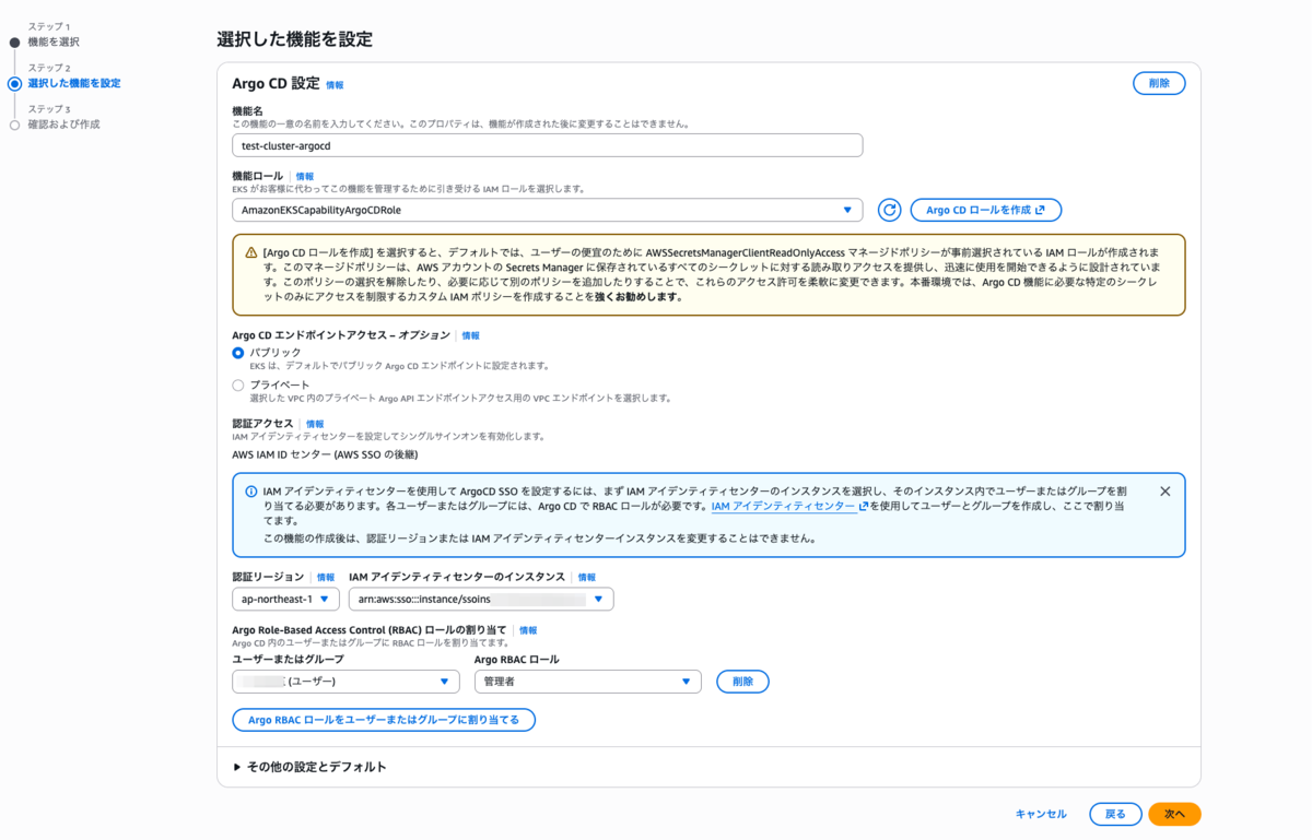 test-cluster-argocd)。 - 機能ロール: Argo CD が AWS リソース(Secrets Manager など)にアクセスするための IAM ロールを指定します。ウィザード上で「Argo CD ロールを作成」を選択すると、推奨ポリシーが適用されたロールを自動作成してくれます。