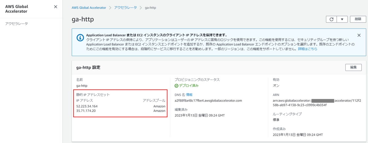 Global Accelerator のコンソールを見てみると、静的パブリック IP アドレスが二つ発行されているのが分かります。