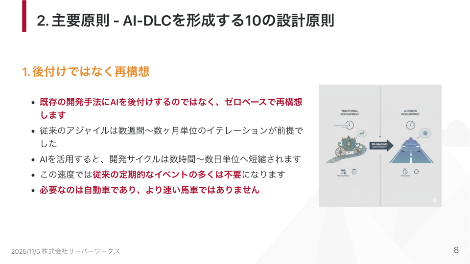 重要なのは、これまでの開発手法に「AIを追加する」のではなく、AIを前提としてゼロから設計し直すという発想の転換です。馬車を速くするのではなく、自動車を使う。この比喩が、AI-DLCの本質を表しています。