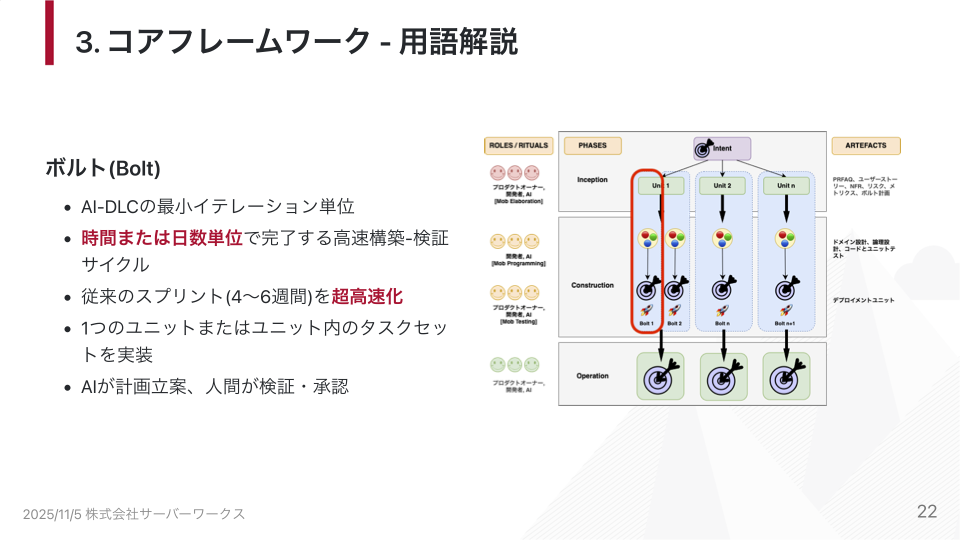 ボルト: 最小単位のイテレーション(スクラムのスプリントに相当。ただし数時間〜数日単位)