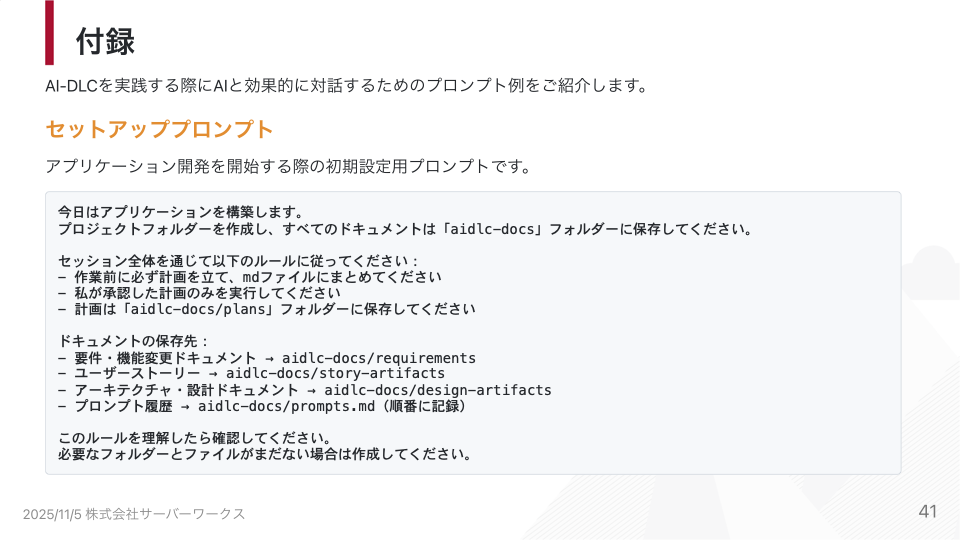 - セットアッププロンプト: フォルダー構成や作業単位を指定