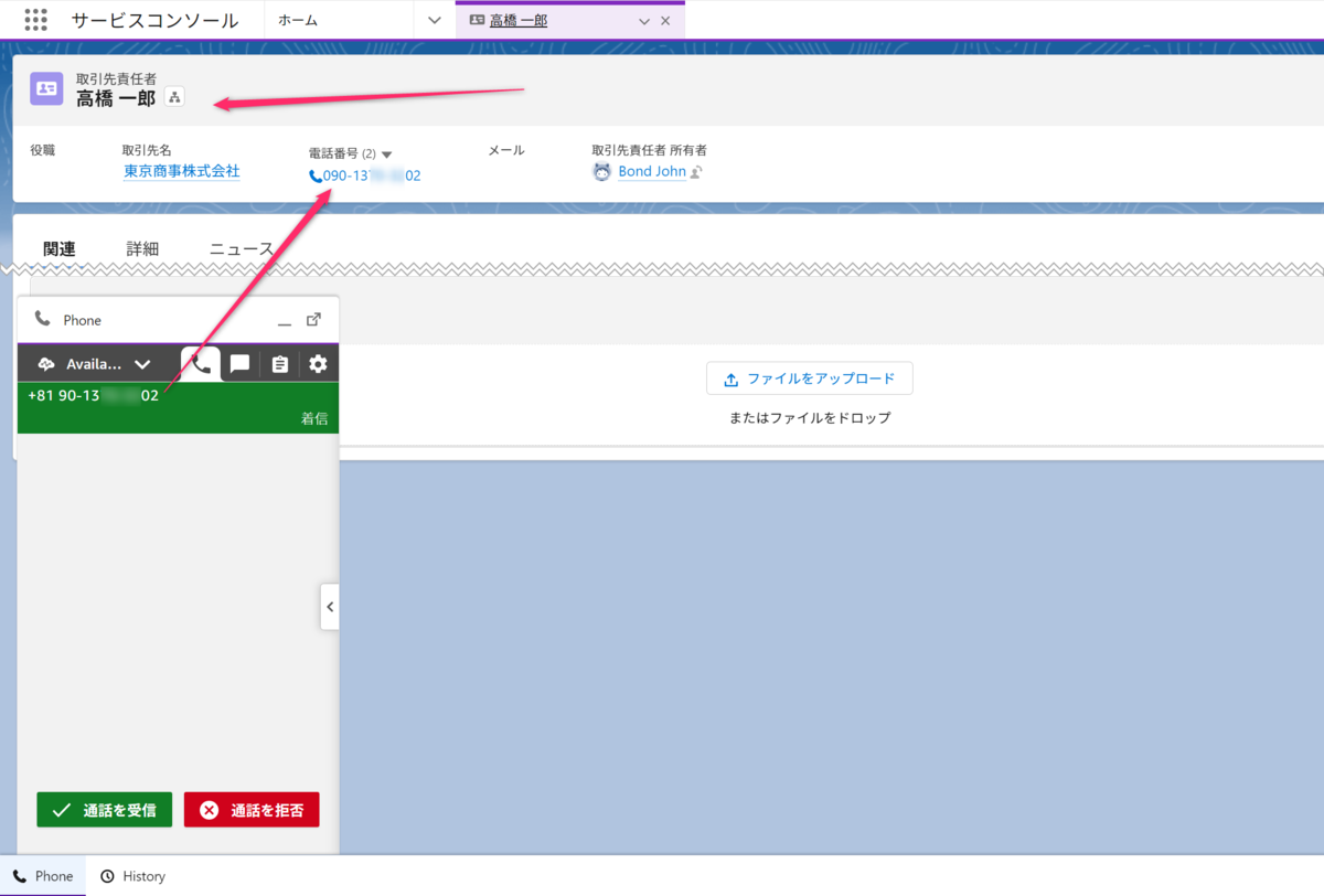 着信と同時にCTIパネルが表示され、少し遅れて検索マッチした取引先責任者ページが表示されました。