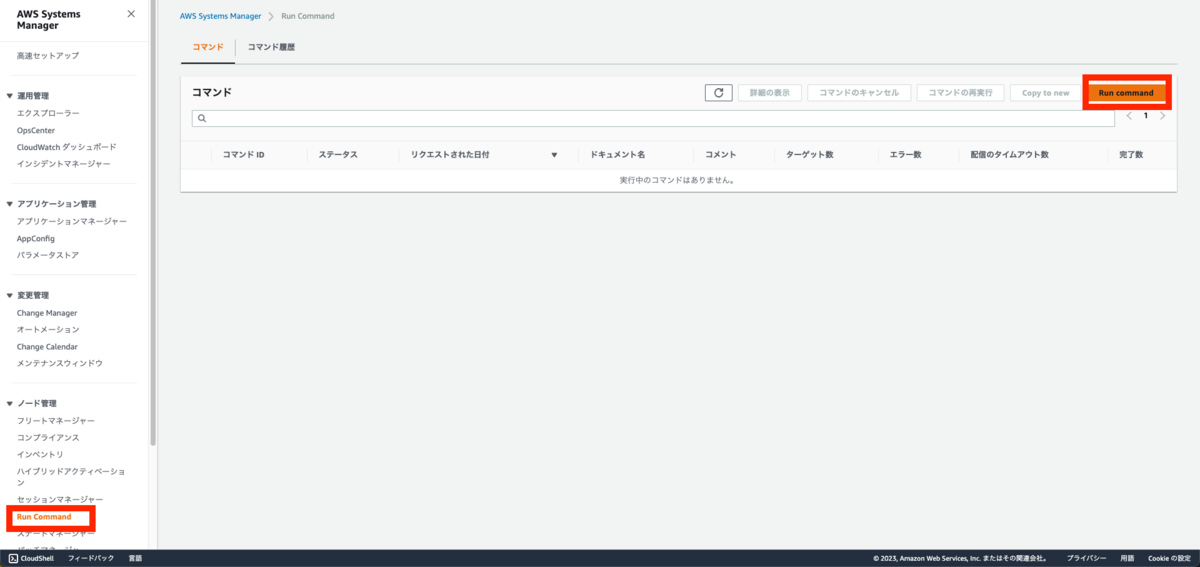[Systems Manager]コンソールへ移動し、[Run Command]を選択します。