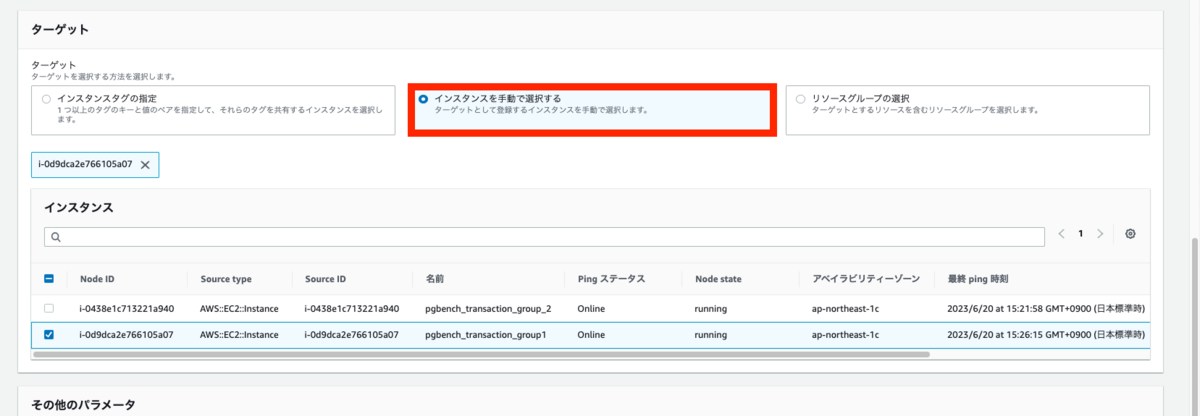 実行するインスタンスを指定します。今回は手動で選択しましょう。