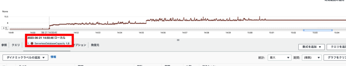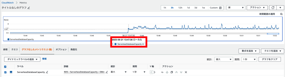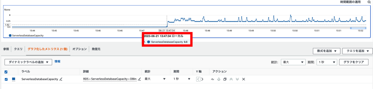 まずは、ServerlessDatabaseCapacityメトリクスだけを確認し、どのくらいの時間でスケールするか確認します。