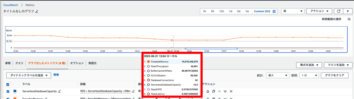 | ServerlessDatabaseCapacity | 使用しているACUの容量を確認できます。クラスターレベルでは平均値が確認できます。インスタンスレベルではインスタンスが使用しているACU量を確認することができます。 |