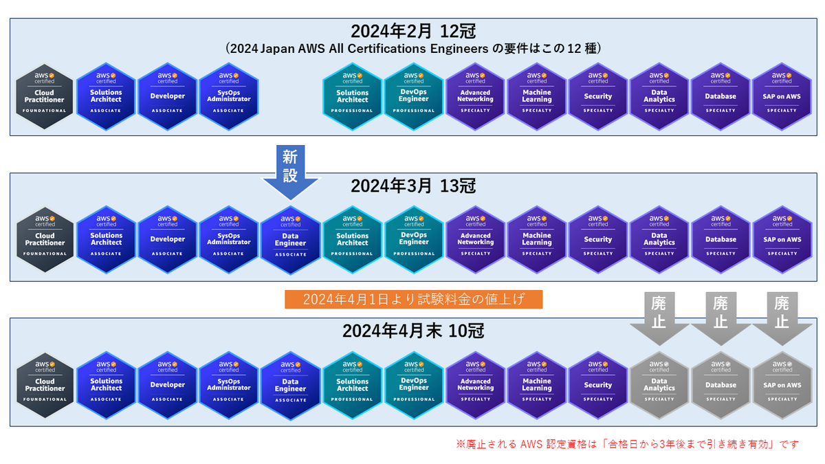 記載した通り、AWS 認定資格におい2024年3月から4月の間に、1つの認定資格が追加され、3つの認識資格が廃止されます。また為替レートの更新により受験料が値上がりとなります。
