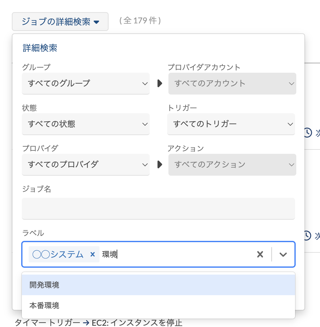 ジョブ一覧画面の詳細検索で、付与したラベルを指定してジョブを絞り込むことができます。登録済みのラベルは入力時にサジェストされます。