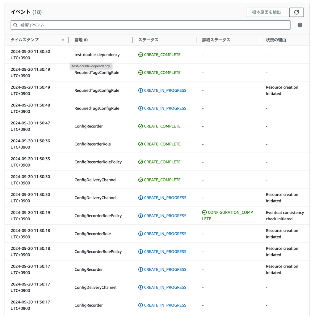 Resources: ConfigRecorderRolePolicy: Type: AWS::IAM::ManagedPolicy Properties: # [...] ConfigRecorderRole: Type: AWS::IAM::Role Properties: # [...] ConfigRecorder: Type: AWS::Config::ConfigurationRecorder Properties: # [...] ConfigDeliveryChannel: Type: AWS::Config::DeliveryChannel Properties: # [...] RequiredTagsConfigRule: Type: AWS::Config::ConfigRule Properties: # [...] DependsOn : - ConfigRecorder #←ここが変更点です! - ConfigDeliveryChannel #←ここが変更点です!