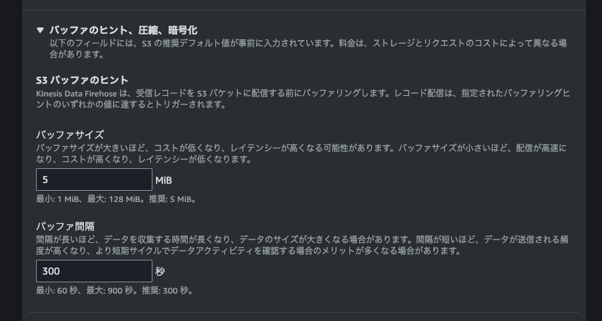 Kinesis Data Firehose でのバッファサイズはそのままとします。