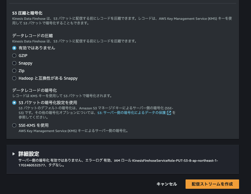 他は特に変えずに、Kinesis Data Firehose の配信ストリームを作成します。Kinesis Data Firehose 用の IAM ロールも自動作成になります。