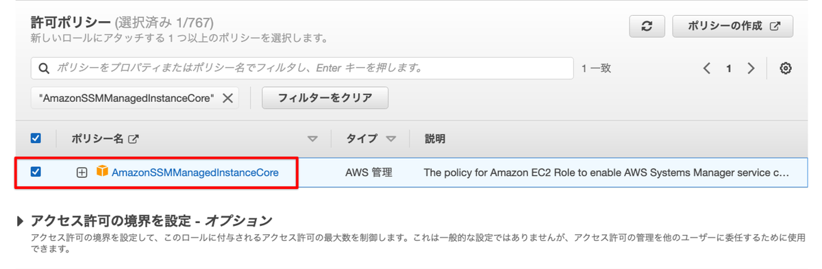 このインストール処理に必要なポリシーがAmazonSSMManagedInstanceCoreです。