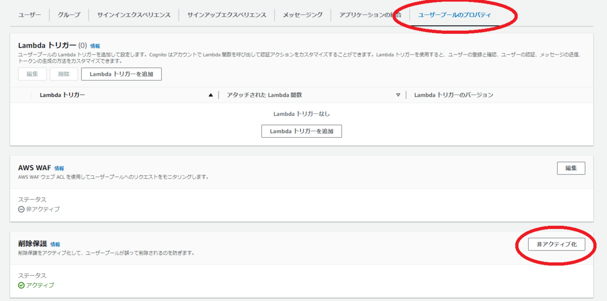 削除の際は、削除保護をかけているので、まずその設定を非アクティブ化します。 [ユーザープールのプロパティ]タブから、削除保護にある非アクティブ化"ボタンで変更します。