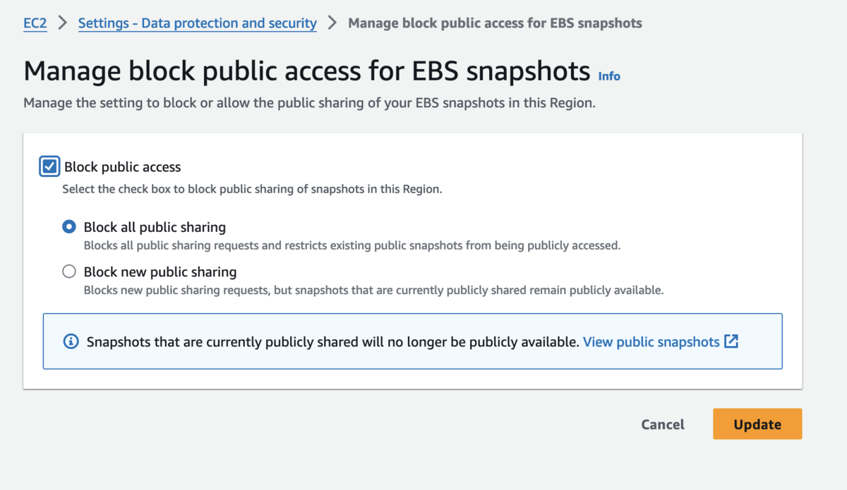 - EBSスナップショットのパブリック共有機能ブロックを有効にしてからスナップショットの新規公開共有のみをブロックします。