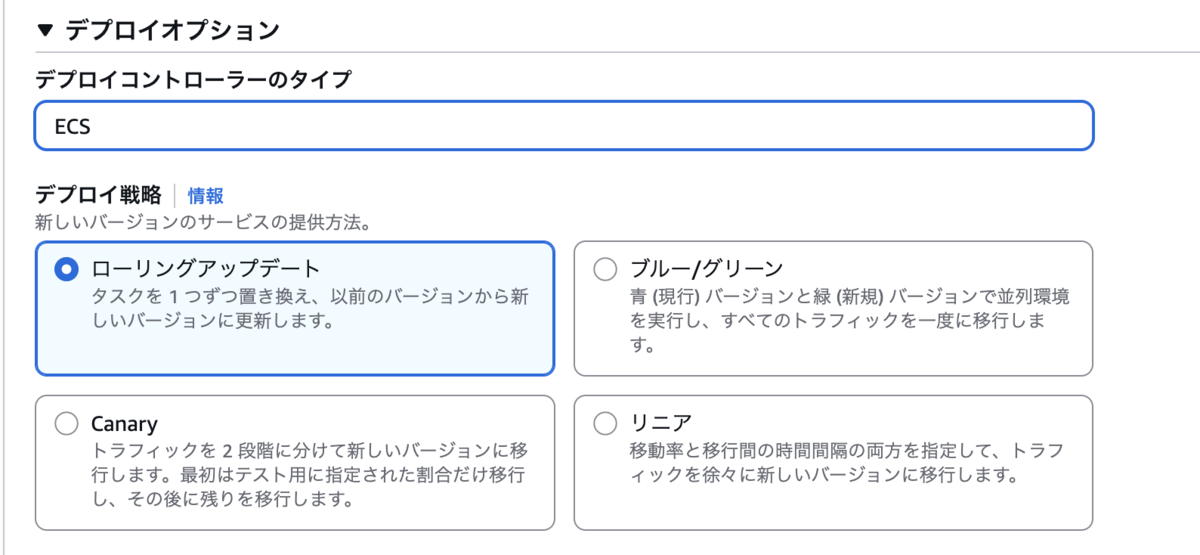 - リニア → CodeDeployDefault.ECSLinear10PercentEvery1Minutes, CodeDeployDefault.ECSLinear10PercentEvery3Minutes