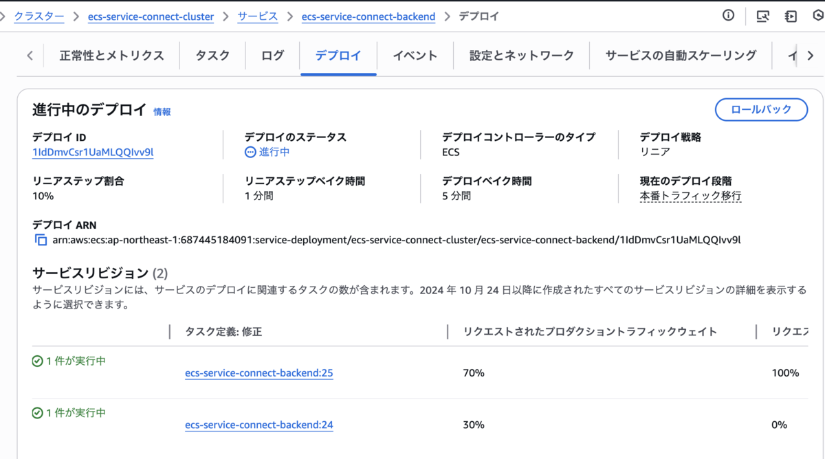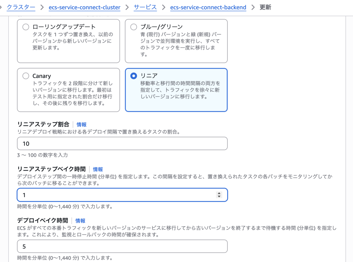 今回のアップデートにより、組み込みデプロイでもカナリアとリニアデプロイが選択できるようになりました。 CodeDeploy の時は、ベイク時間を細かく設定したい時は自身で定義する必要があるなど、一手間必要だったのがパラメータ一つでできるようになり、 さらにロードバランサー配下のサービスでなくともService Connect を使うことでカナリア、リニアの選択肢を選ぶことができるようになったいいアップデートだと感じました。