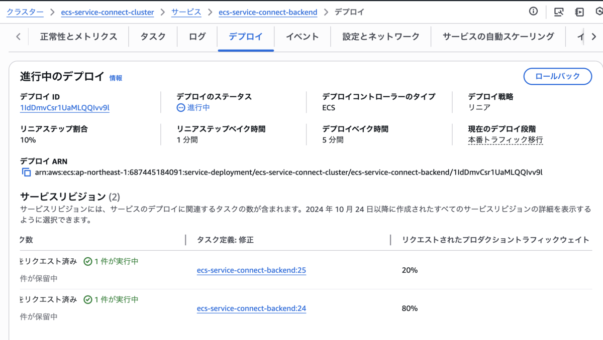 リニアで新しいリビジョンをデプロイしてみます。 デプロイタブの「リクエストされたプロダクショントラフィックウェイト」をみることで、現在リニアステップのどの段階かを確認することができます。