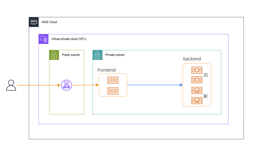 構成は以前の私のブログの形式に対して、Service Connect を使い、backend サービスをデプロイするとします。