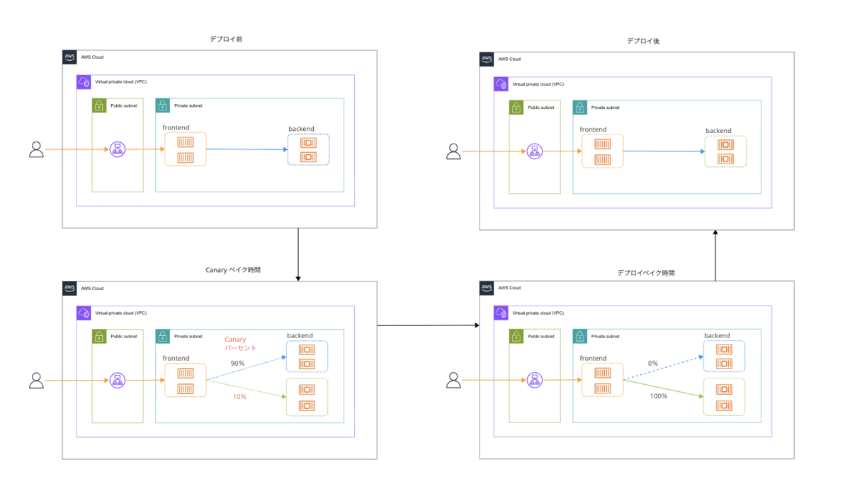 徐々にグリーン環境へトラフィックが移行していることがわかります。 全体の流れを図で表すと、以下のようになります。
