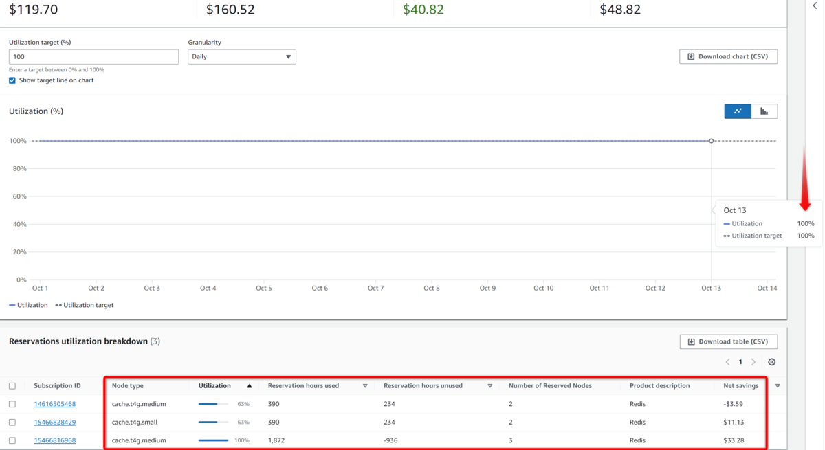 最下部「cache.t4g.medium」の使用率は 100% ですが、「Reservation hours unused」が「-936表記」となってしまっています。他の RN も使用率は 100% ではないのにも関わらず、全ての使用率を鑑みて表示されるグラフの使用率は、100% となってしまっています。