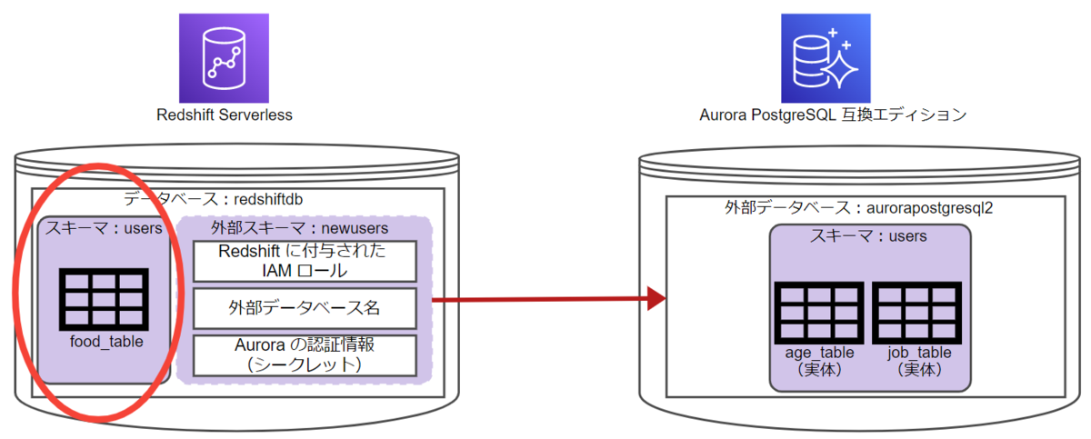 CREATE EXTERNAL SCHEMA newusers FROM POSTGRES DATABASE 'aurorapostgresql2' SCHEMA 'users' URI 'database-2.cluster-cno8jxqxarf4.ap-northeast-1.rds.amazonaws.com' PORT 5432 IAM_ROLE 'arn:aws:iam::xxxxxxxxxxxx:role/service-role/yyyyMMdd-Redshift-ServerlessRole' SECRET_ARN 'arn:aws:secretsmanager:ap-northeast-1:xxxxxxxxxxxx:secret:dev/Redshift-FederatedQuery/Aurorapostgresql-Y9Ih4g';