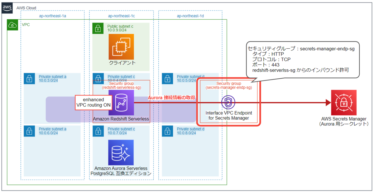 Redshift Serverless の設定で「拡張された VPC のルーティング」を有効にしている場合、Secrets Manager からシークレットを取得するために VPC エンドポイントが必要です。