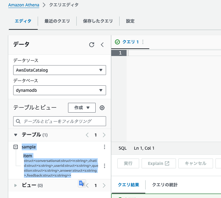 Athenaのコンソールから確認すると以下のようにsampleというテーブルが作成されていることが分かると思います。