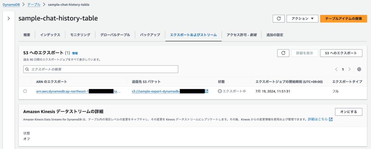 DynamoDBのコンソールから確認すると以下のようにエクスポートが実行されていることが分かると思います。