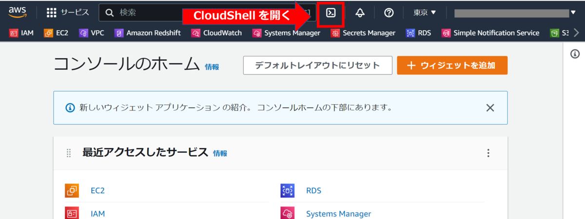 ナビゲーションバーの CloudShell アイコンをクリックして CloudShell を開きます。