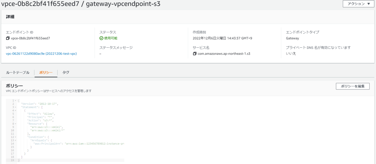 --vpc-id vpc-06261122d9080ac9e \:VPC ID を設定します。--service-name com.amazonaws.ap-northeast-1.s3 \:今回は S3 の VPC エンドポイントを作成するので、com.amazonaws.ap-northeast-1.s3を指定します。--route-table-ids rtb-0b9d6dcf281069286 \:ゲートウェイ型 VPC エンドポイントはルートテーブルにルートが追加されます。ルートを追加するルートテーブル ID を設定します。--vpc-endpoint-type Gateway \:ここでゲートウェイ型を指定します。--tag-specifications "ResourceType=vpc-endpoint,Tags=[{Key=Name,Value=gateway-vpcendpoint-s3}]" \:タグ付けします。--policy-document file://$(pwd)/vpc_endpoint_policy.json:作成したポリシードキュメントの .json ファイルを指定しています。実行結果