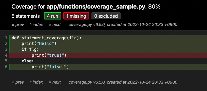 この場合、全 4 行の命令のうち、4行目の print("world!") は実行されませんので、C0 カバレッジは 3/4 = 75% ということになります。