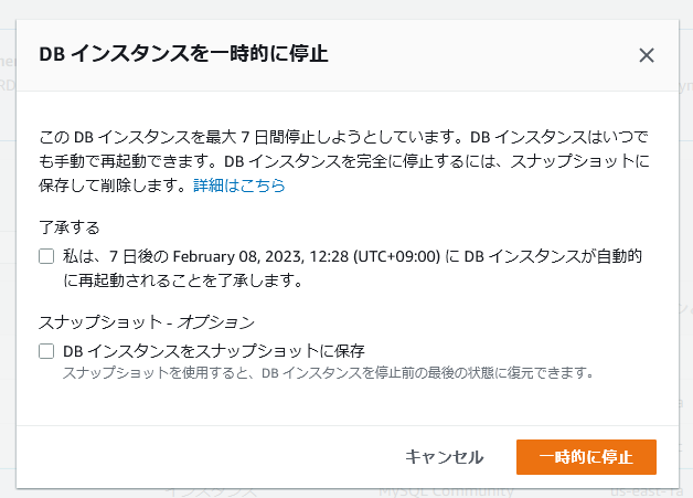 AWSコンソールから一時的に停止する操作を行うと下記のようなポップアップで自動起動される日時が表示されます。