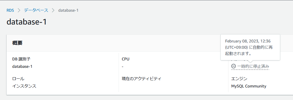 Aurora以外で既に一時的に停止状態になっている場合は、AWSコンソールのRDSインスタンスの詳細画面から自動起動する日時を確認することができます。