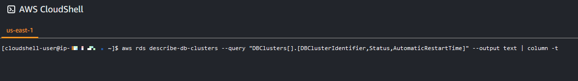 [cloudshell-user@ip-**-**-**-** ~]$ aws rds describe-db-clusters --query "DBClusters[].[DBClusterIdentifier,Status,AutomaticRestartTime]" --output text | column -t database-cluster-1 stopped 2023-02-08T07:50:31.442000+00:00