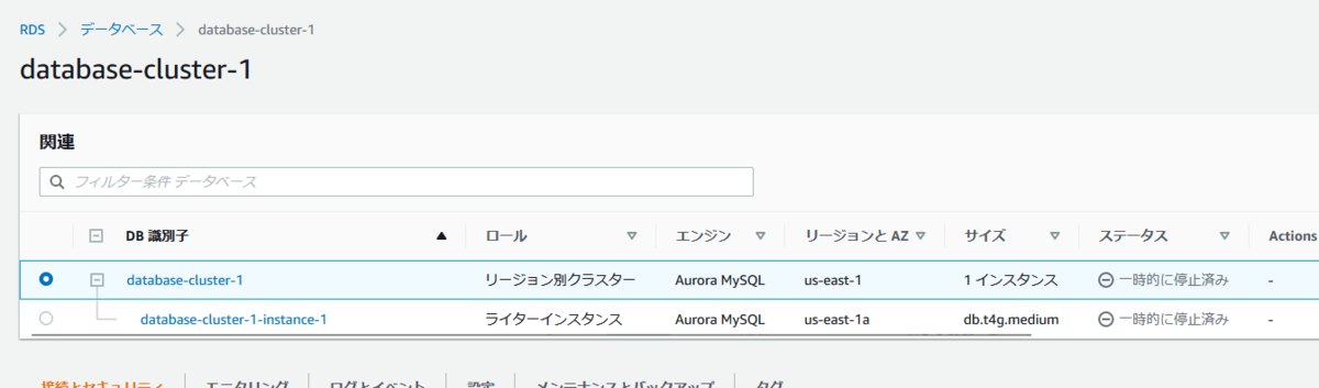 AWSコンソールの詳細画面が下記のようにクラスター・インスタンスの両方が表示されるUIになっており、ステータスの「一時的に停止済み」をクリックしても何も表示されません。