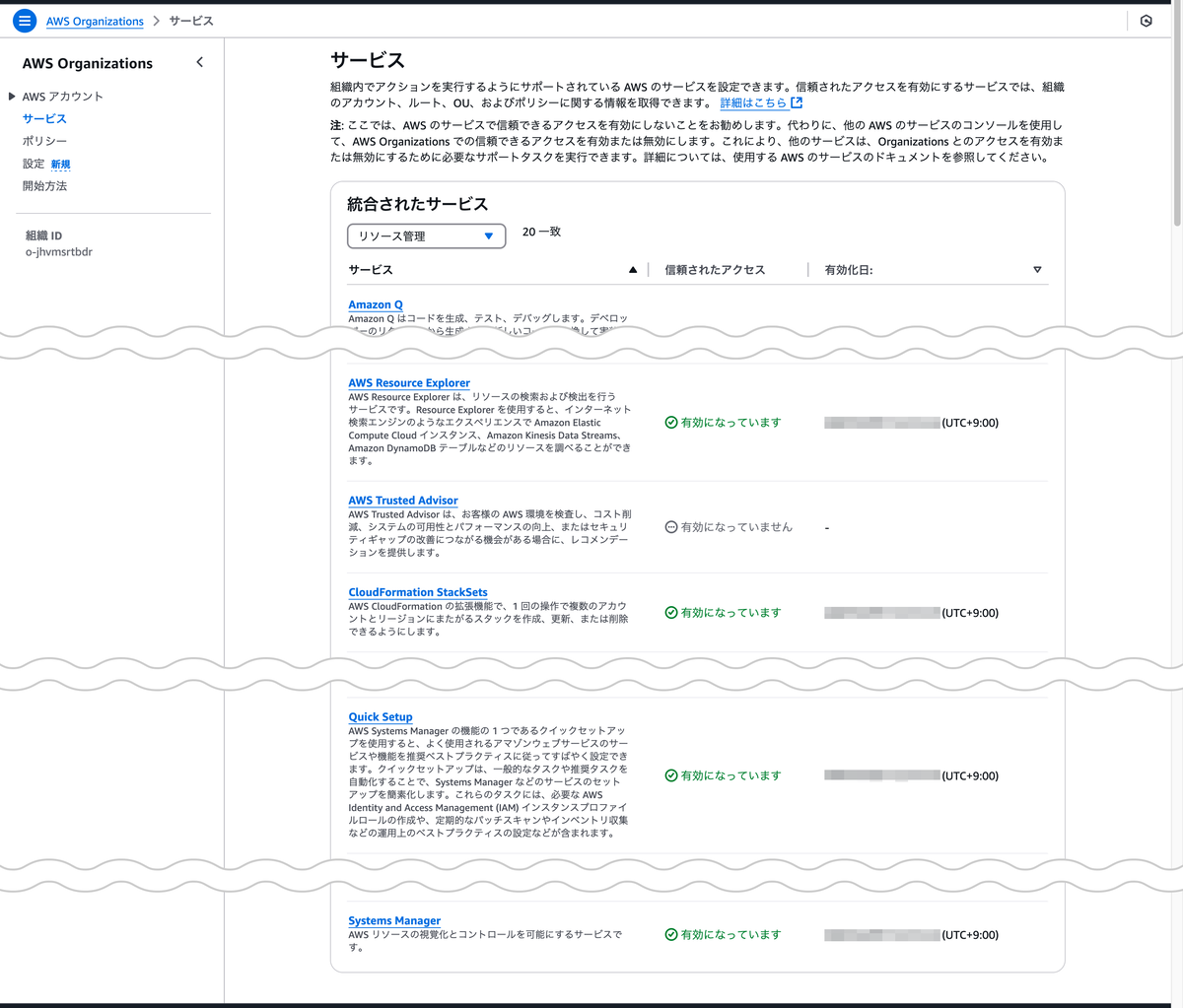 有効化することで、そのサービスは組織内の複数のアカウントやリージョンを対象に、横断的な操作やリソースの展開を実行できるようになります。