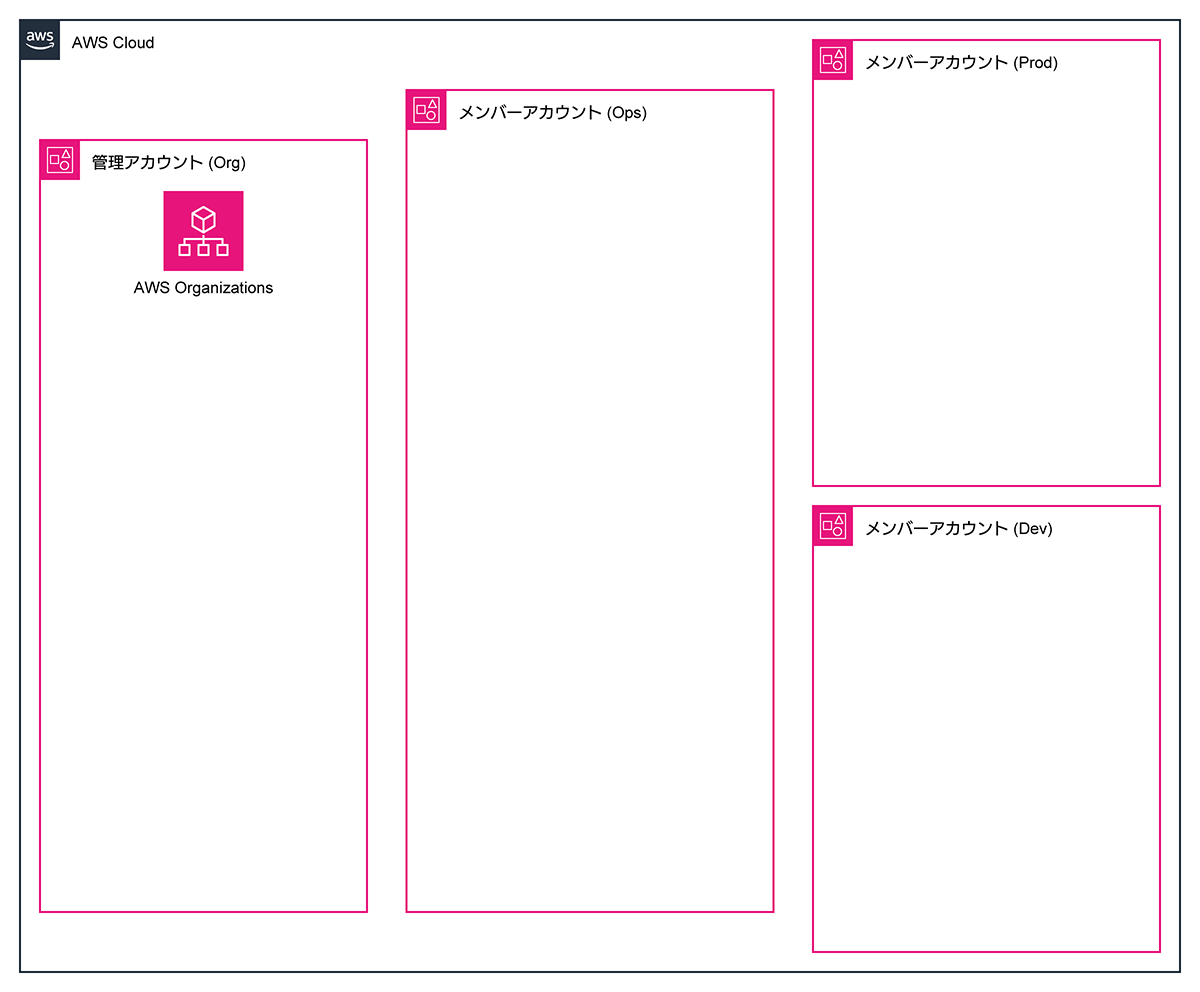 | メンバーアカウント (Ops): | 後の手順で「委任された管理者」になるアカウント。「委任された管理者」とは、特定のサービスの管理を、管理アカウントではなく、他のメンバーアカウントに任せるための仕組み。 |