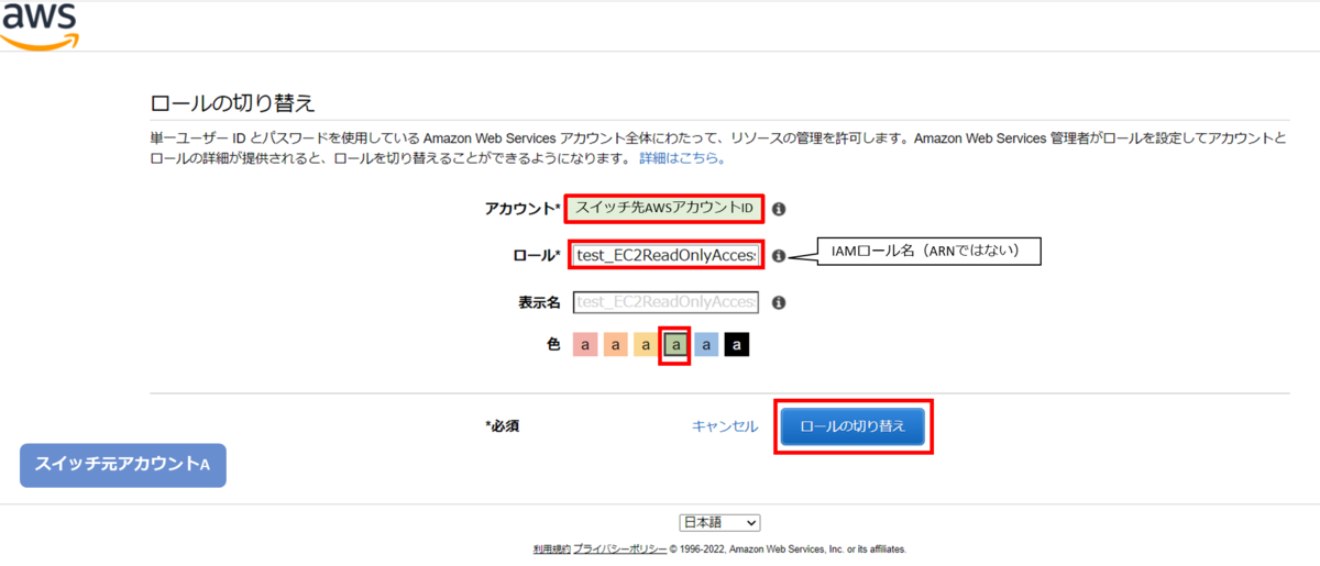 - スイッチ元アカウントAの AWS アカウント ID を入力する